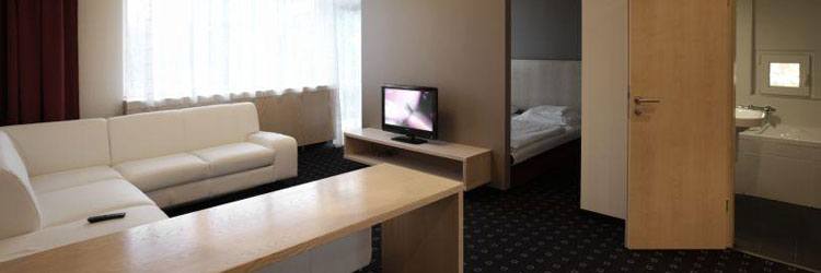 Nagy és elegáns, klimatizált lakosztály, ajtóval vagy fallal elválasztott nappalival üzleti utasaink vagy akár családok részére.